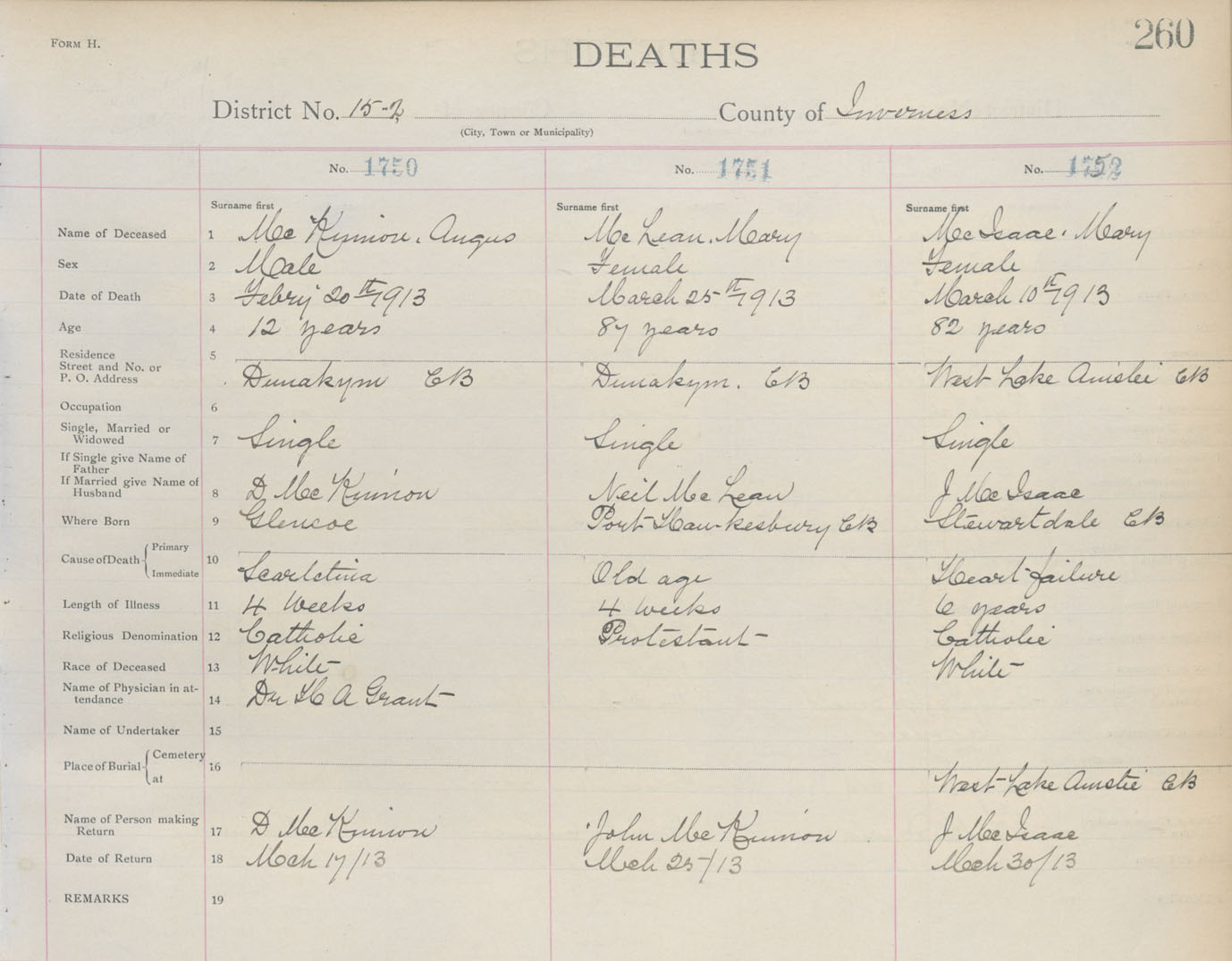 Death Registration: Year: 1913 book: 11 page: 260 number: 1752