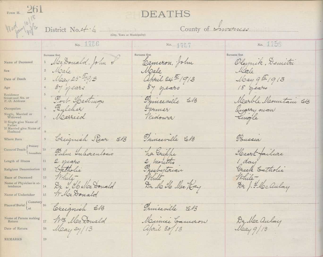 Male Death Registration: Year: 1913 book: 11 page: 261 number: 1758