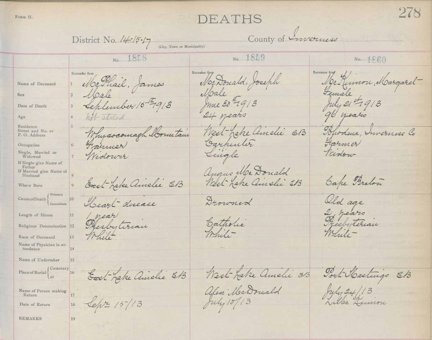 Death Registration: Year: 1913 book: 11 page: 278 number: 1860