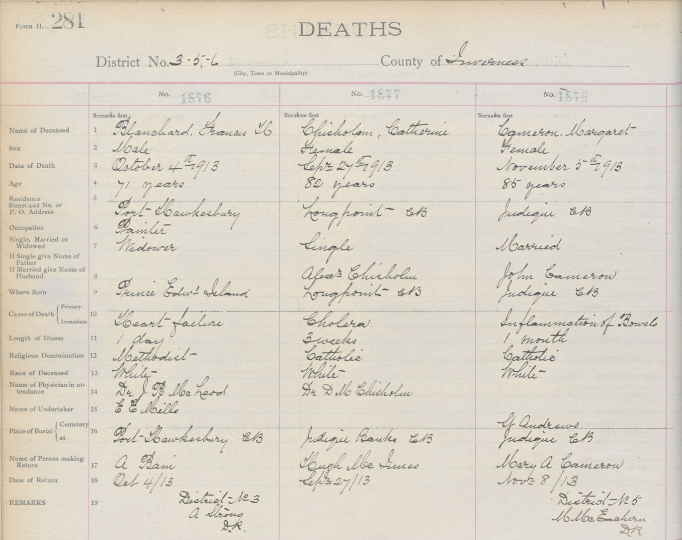 Female Death Registration: Year: 1913 book: 11 page: 281 number: 1878