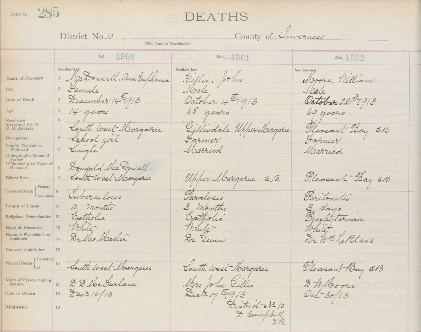 Death Registration: Year: 1913 book: 11 page: 285 number: 1900