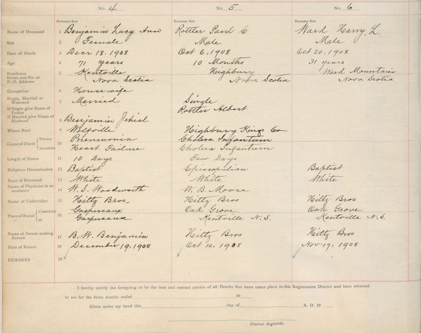 Female Death Registration: Year: 1908 book: 12 page: 1 number: 4