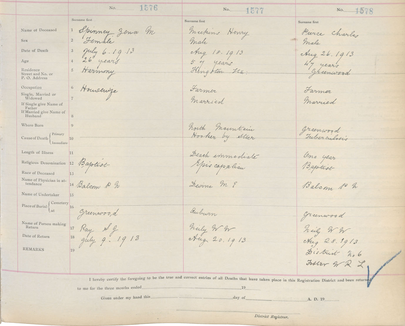 Male Death Registration: Year: 1913 book: 12 page: 258 number: 1578
