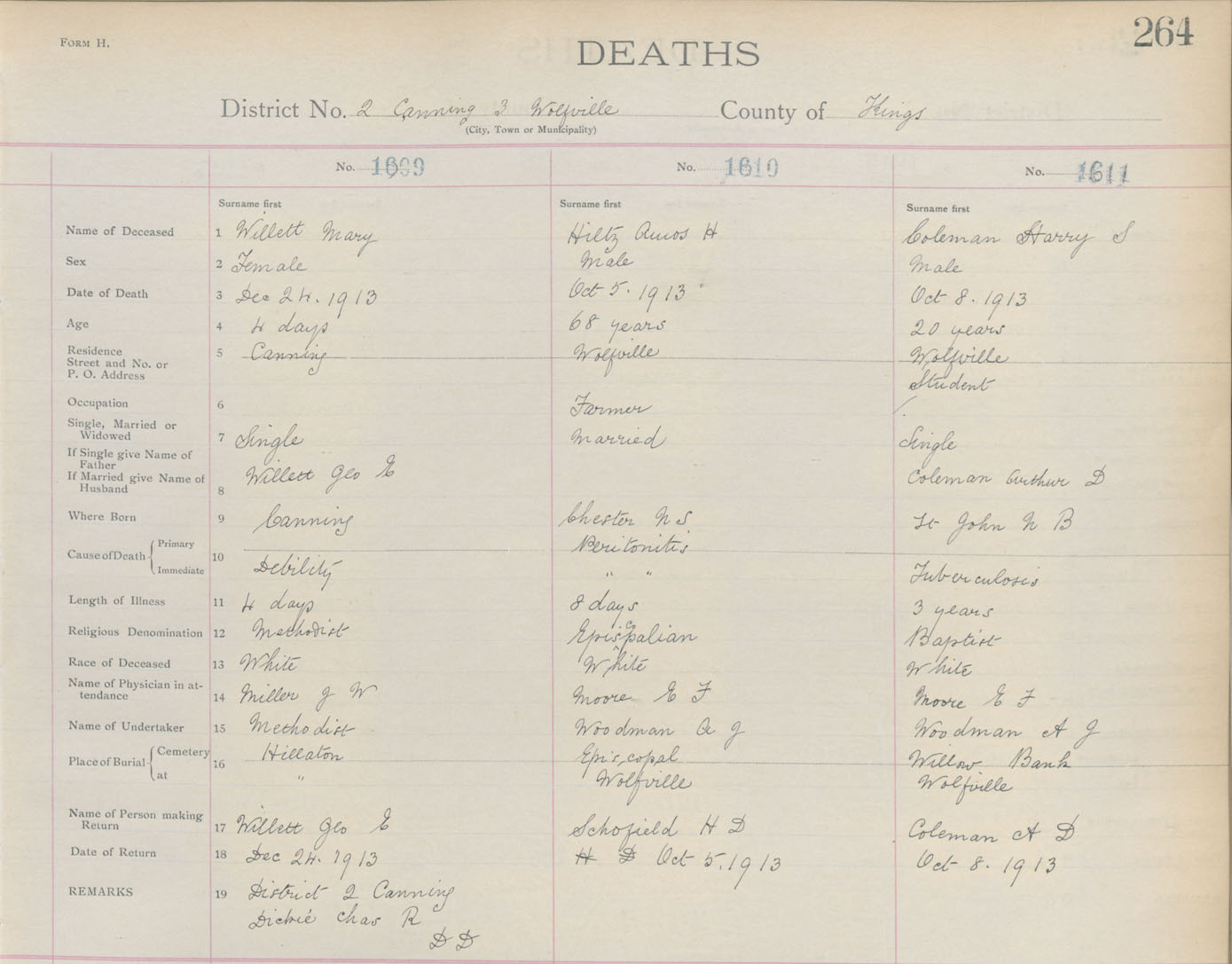 Male Death Registration: Year: 1913 book: 12 page: 264 number: 1611