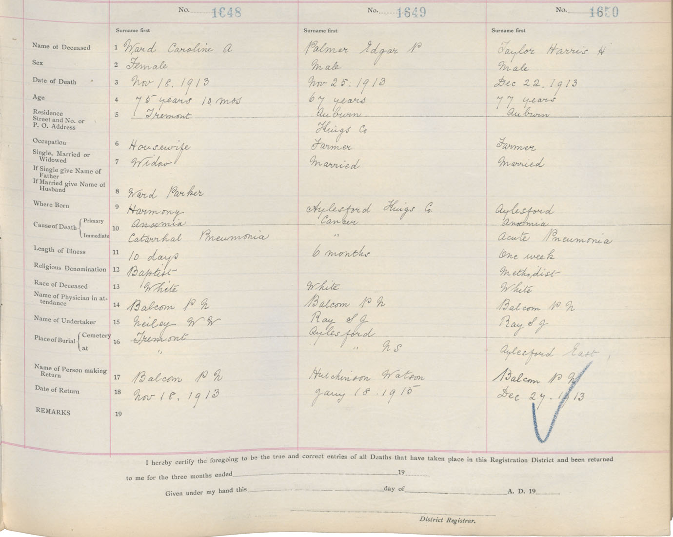Male Death Registration: Year: 1913 book: 12 page: 270 number: 1650