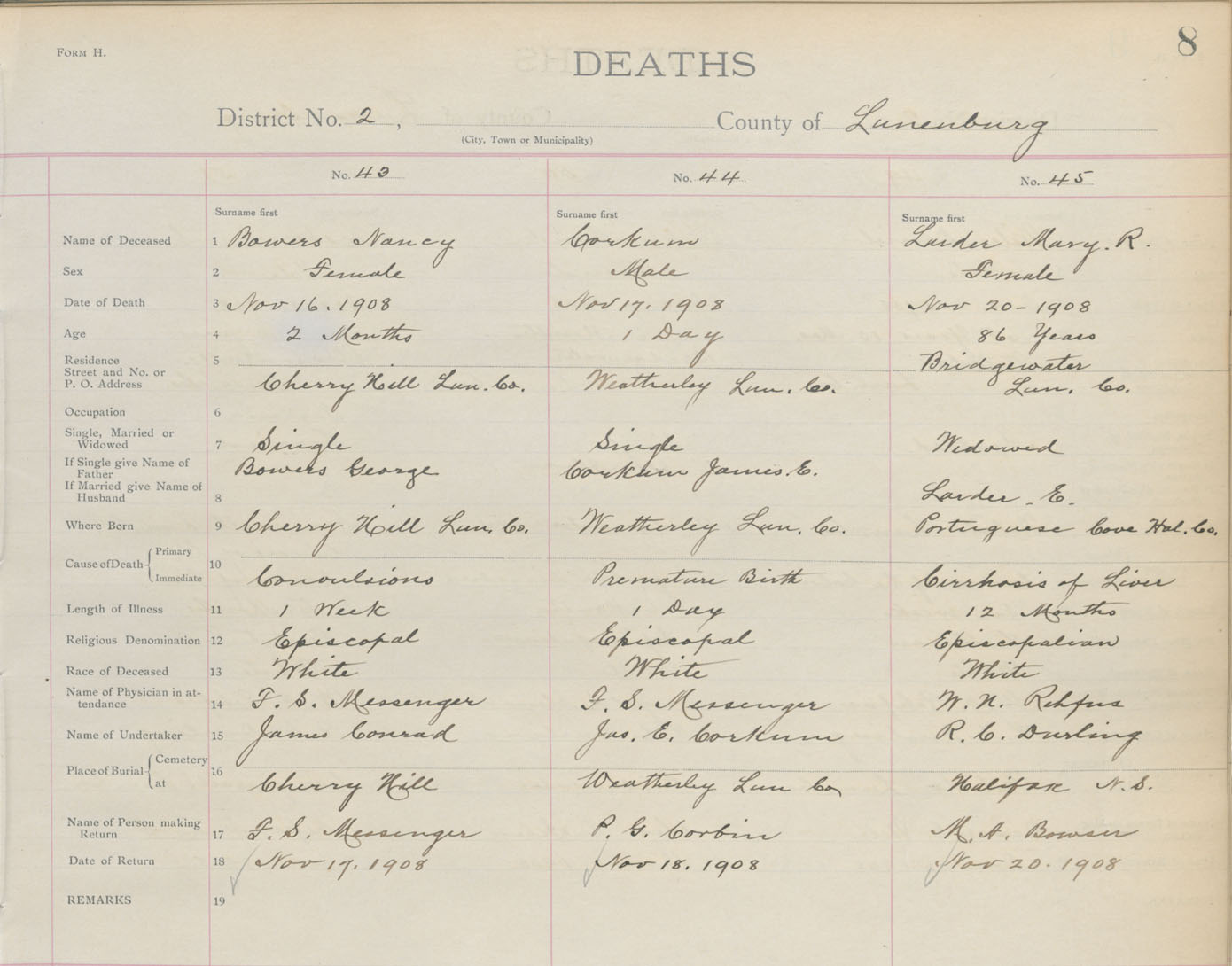 Death Registration: Year: 1908 book: 13 page: 8 number: 45