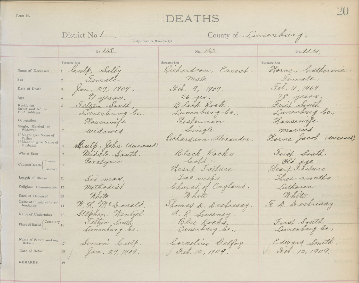 Death Registration: Year: 1909 book: 13 page: 20 number: 112
