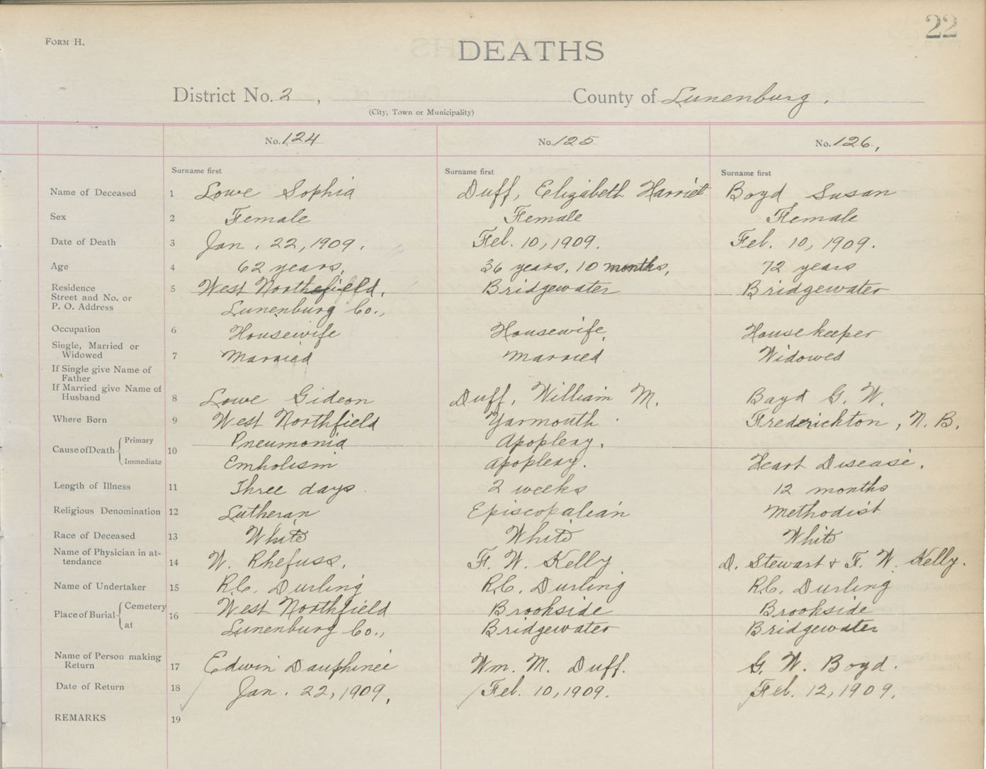 Death Registration: Year: 1909 book: 13 page: 22 number: 124