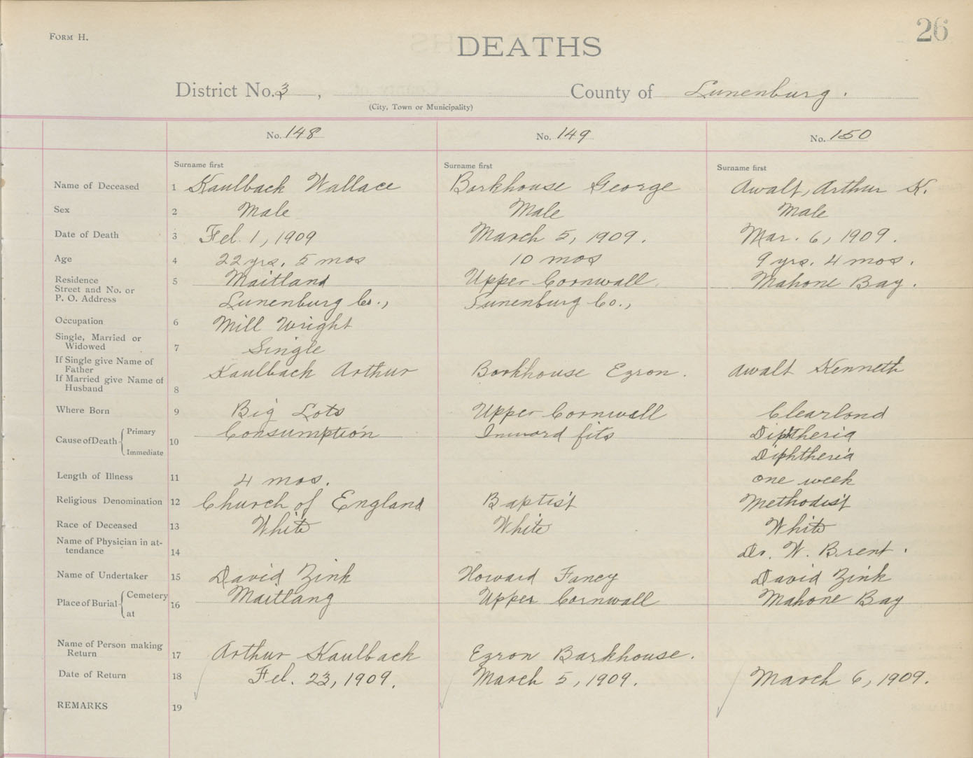 Death Registration: Year: 1909 book: 13 page: 26 number: 148