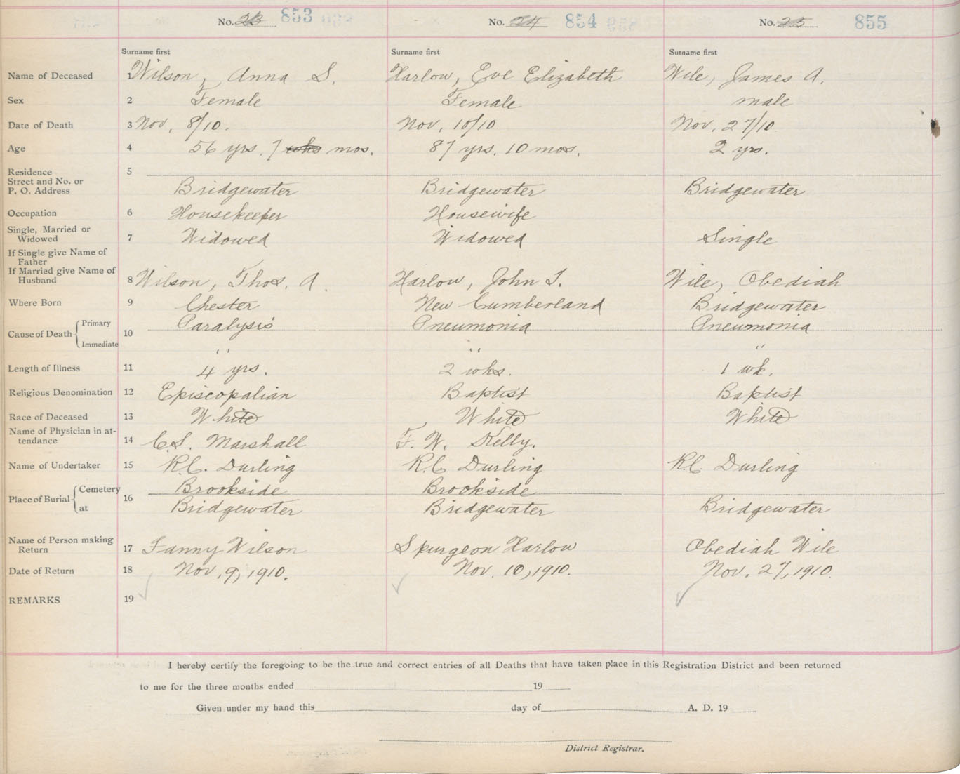 Death Registration: Year: 1910 book: 13 page: 143 number: 855