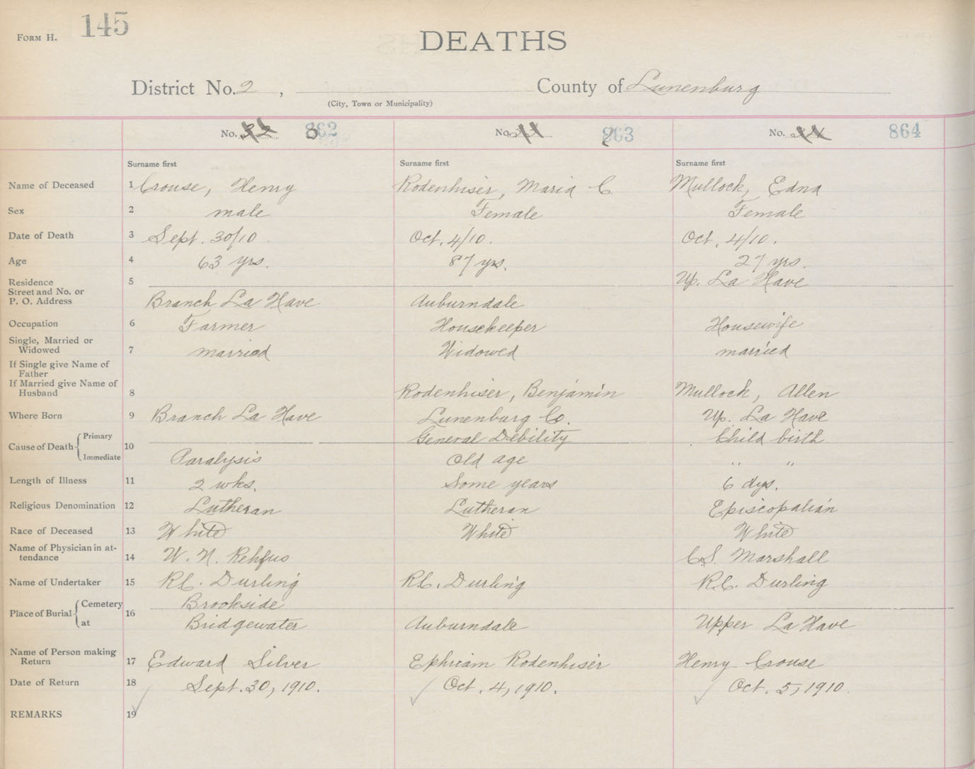 Death Registration: Year: 1910 book: 13 page: 145 number: 864