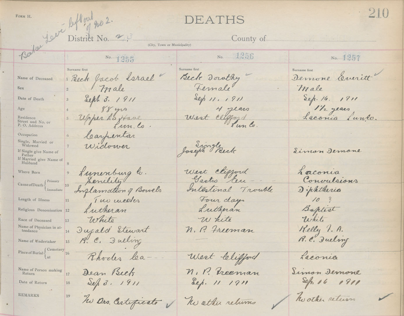 Death Registration: Year: 1911 book: 13 page: 210 number: 1255