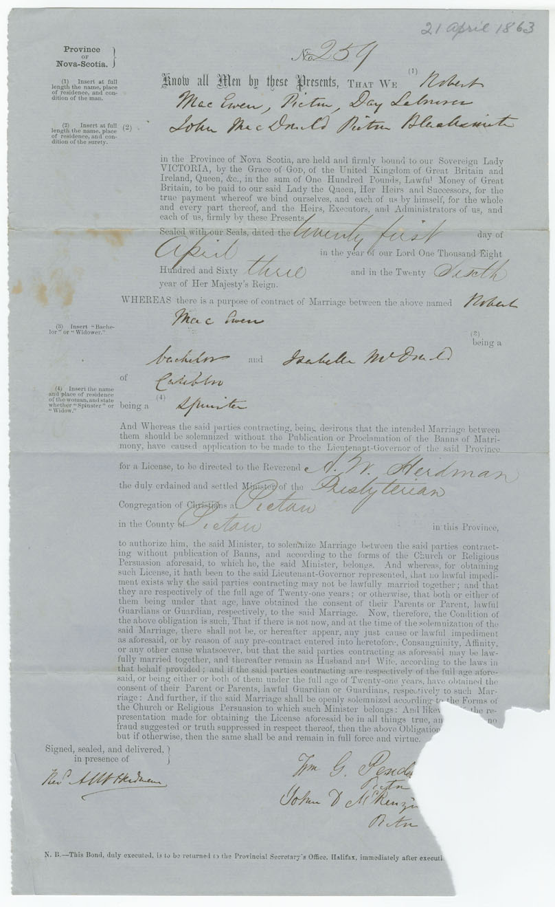 Note: directed to Rev. Andrew W. Herdman, Pictou, Presbyterian