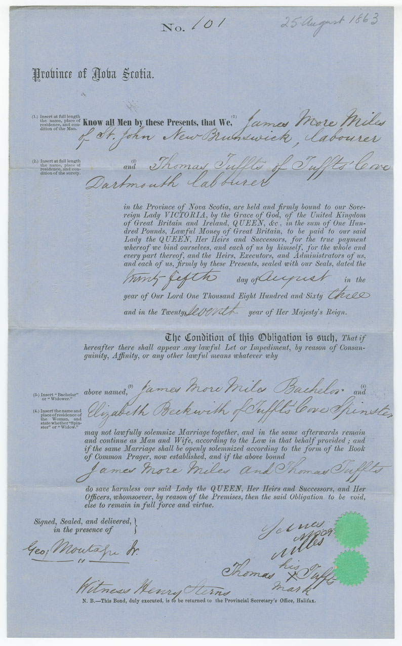 Note: signed by Thomas Tufts, Tufts Cove, labourer