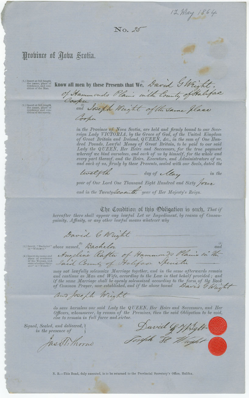 Note: signed by Joseph Wright, Hammonds Plains, cooper