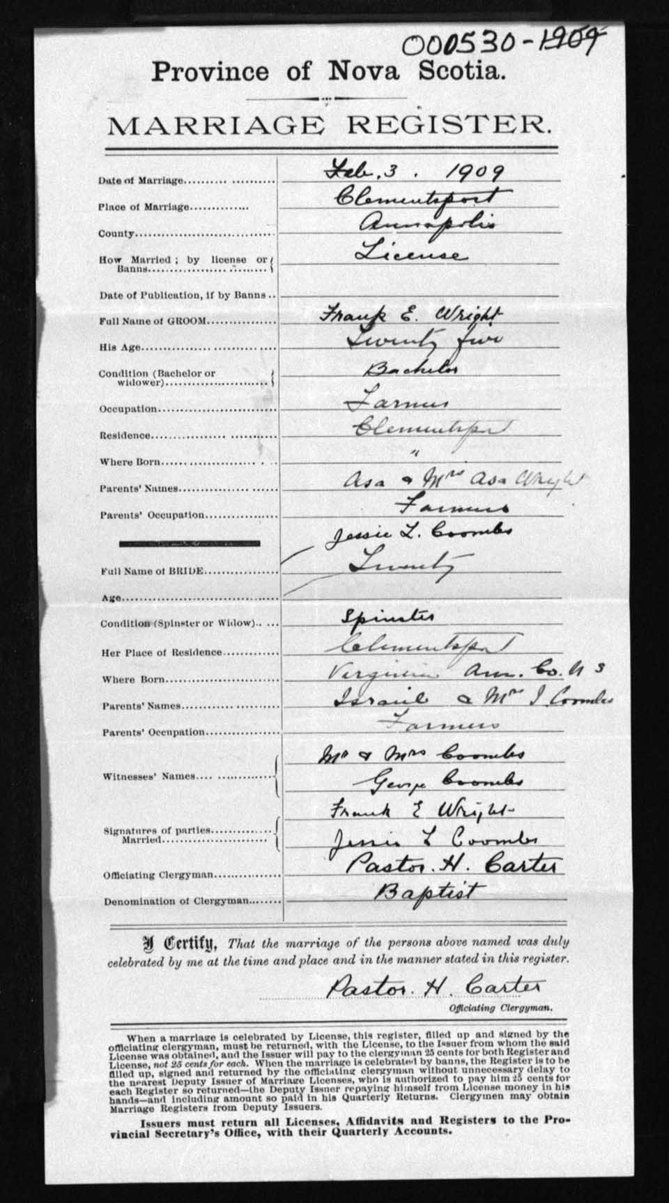 Registration: Year: 1909 number: 0530