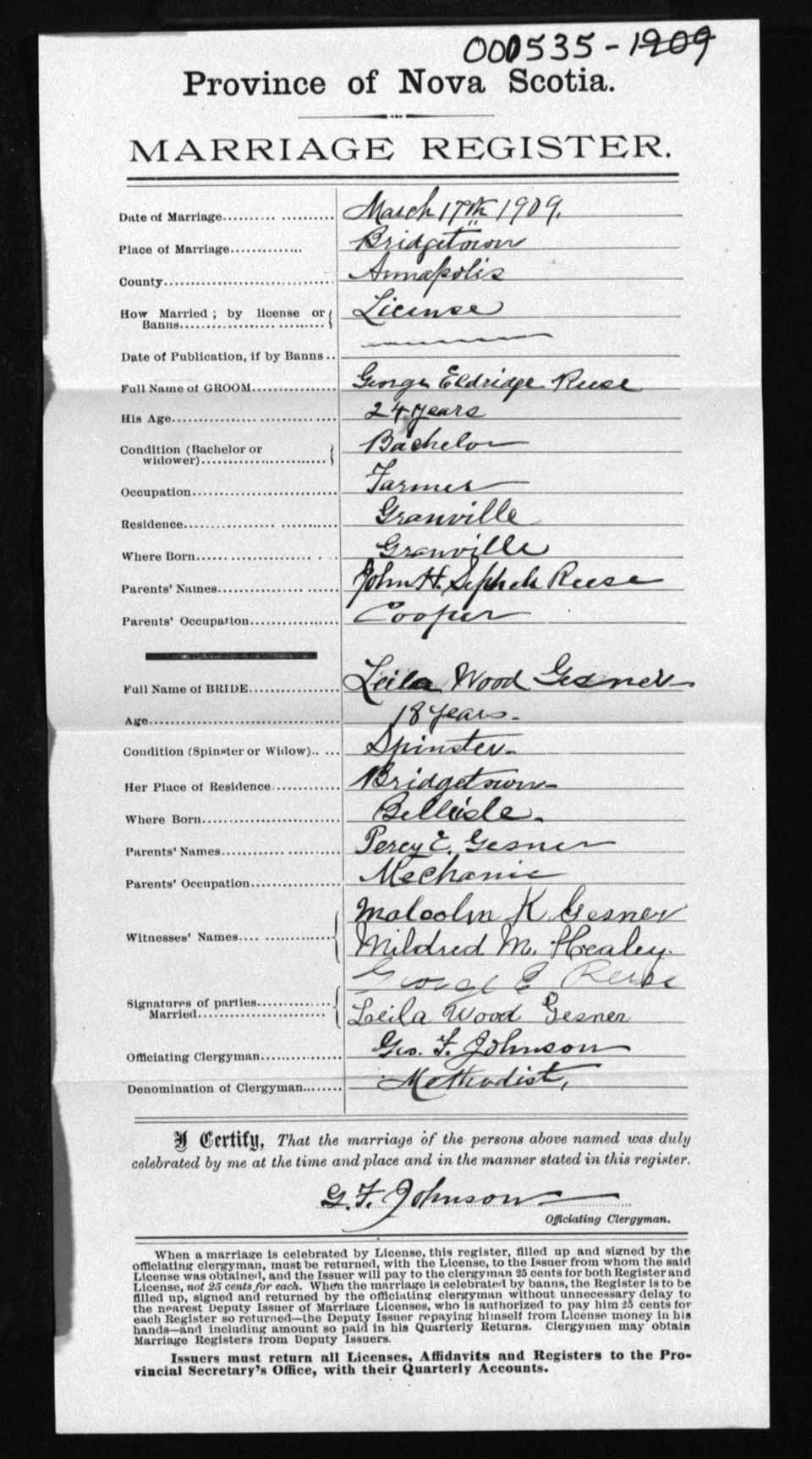 Registration: Year: 1909 number: 0535