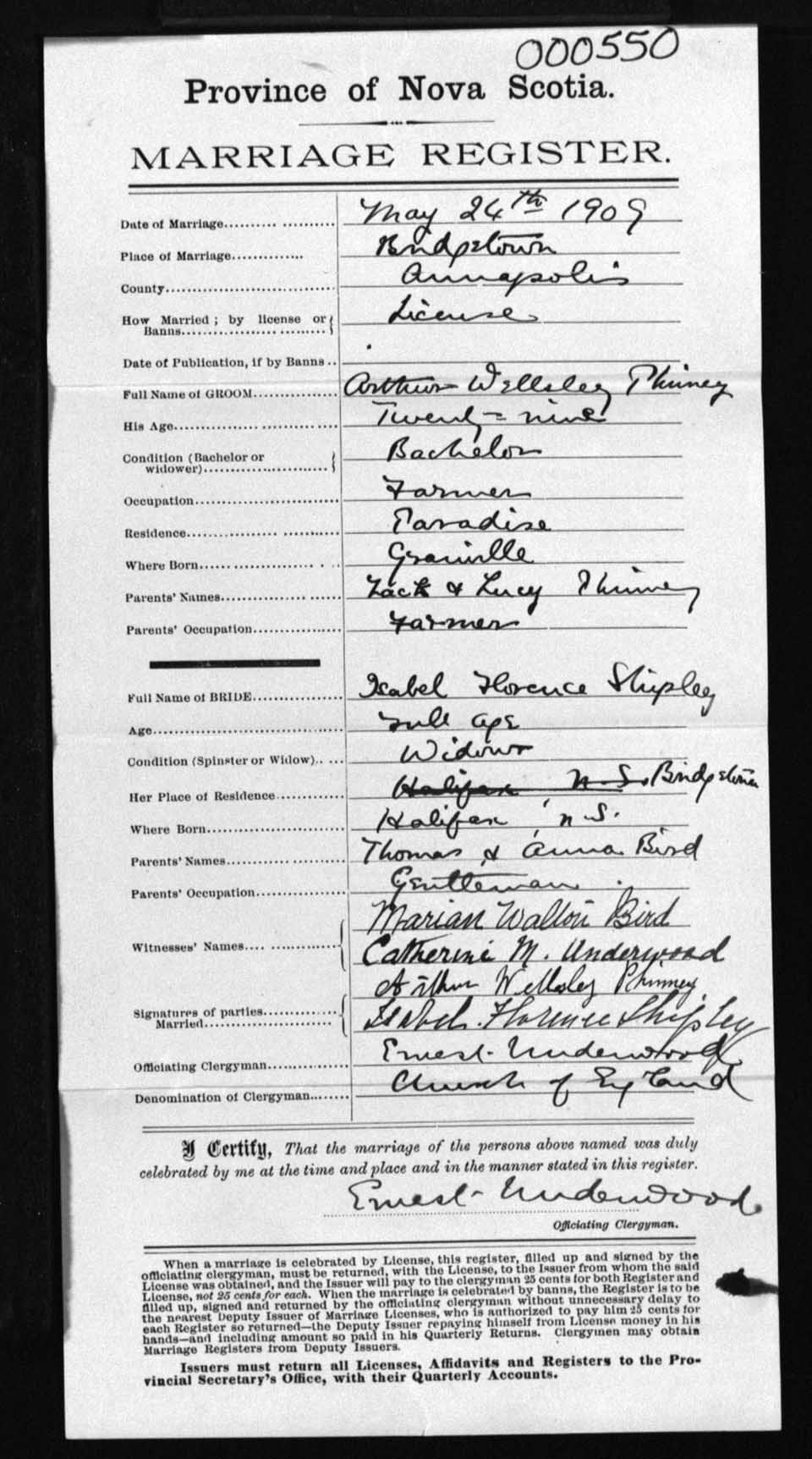 Registration: Year: 1909 number: 0550