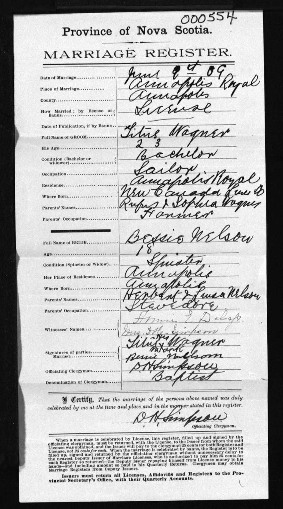 Registration: Year: 1909 number: 0554