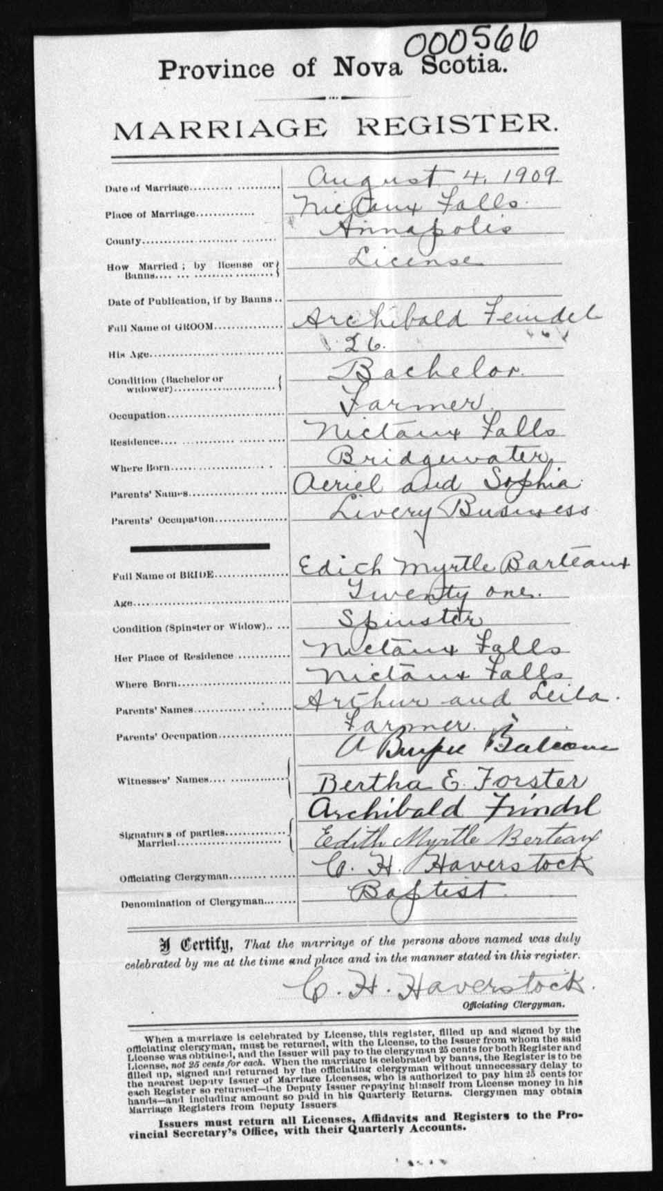 Registration: Year: 1909 number: 0566