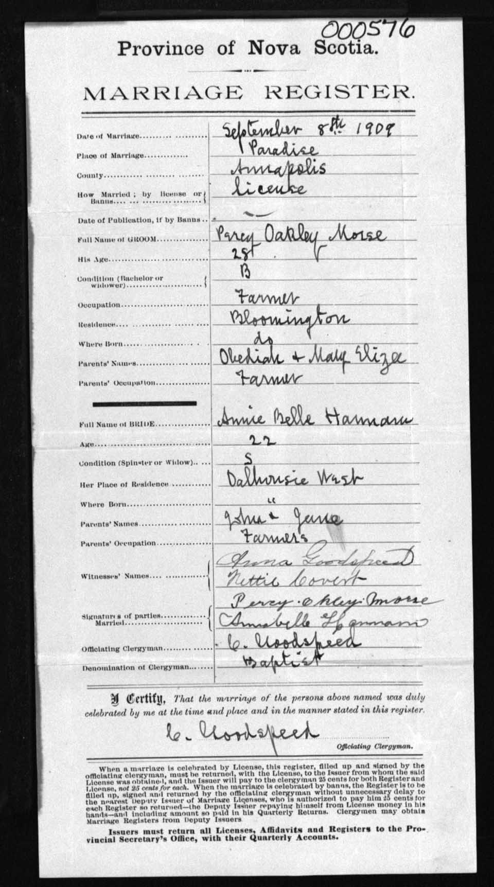 Registration: Year: 1909 number: 0576