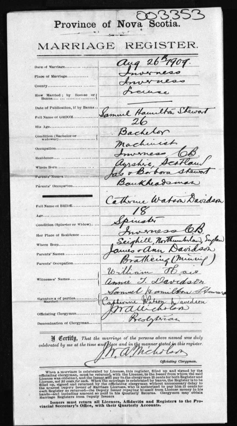 Registration: Year: 1909 number: 3353
