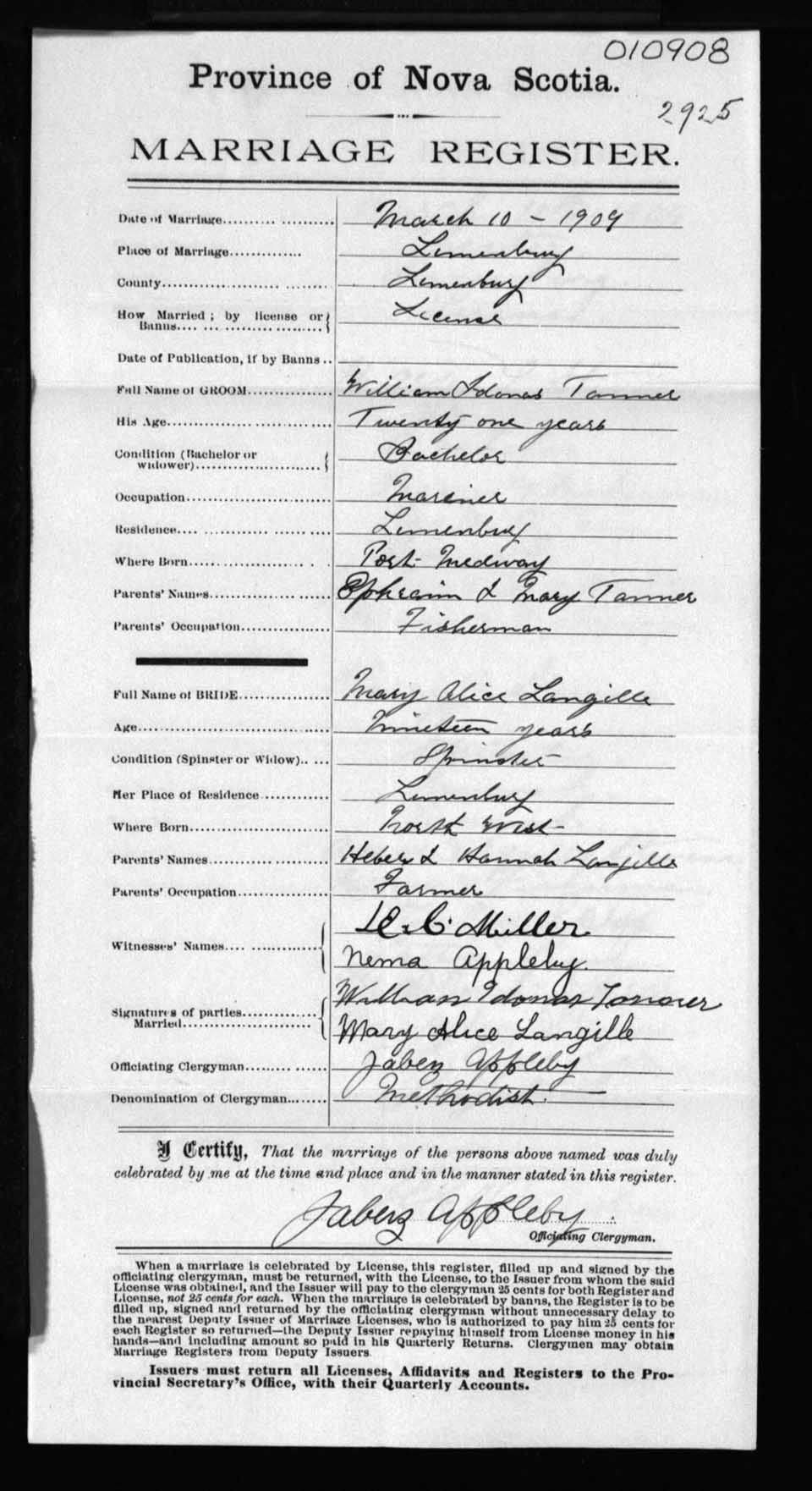 Registration: Year: 1909 number: 10908