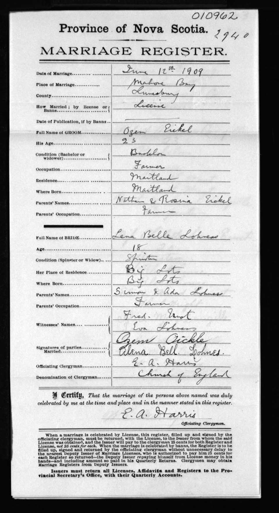 Registration: Year: 1909 number: 10962
