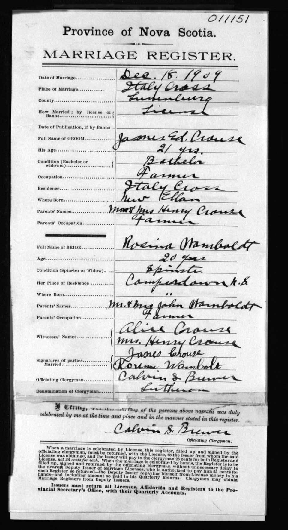 Registration: Year: 1909 number: 11151