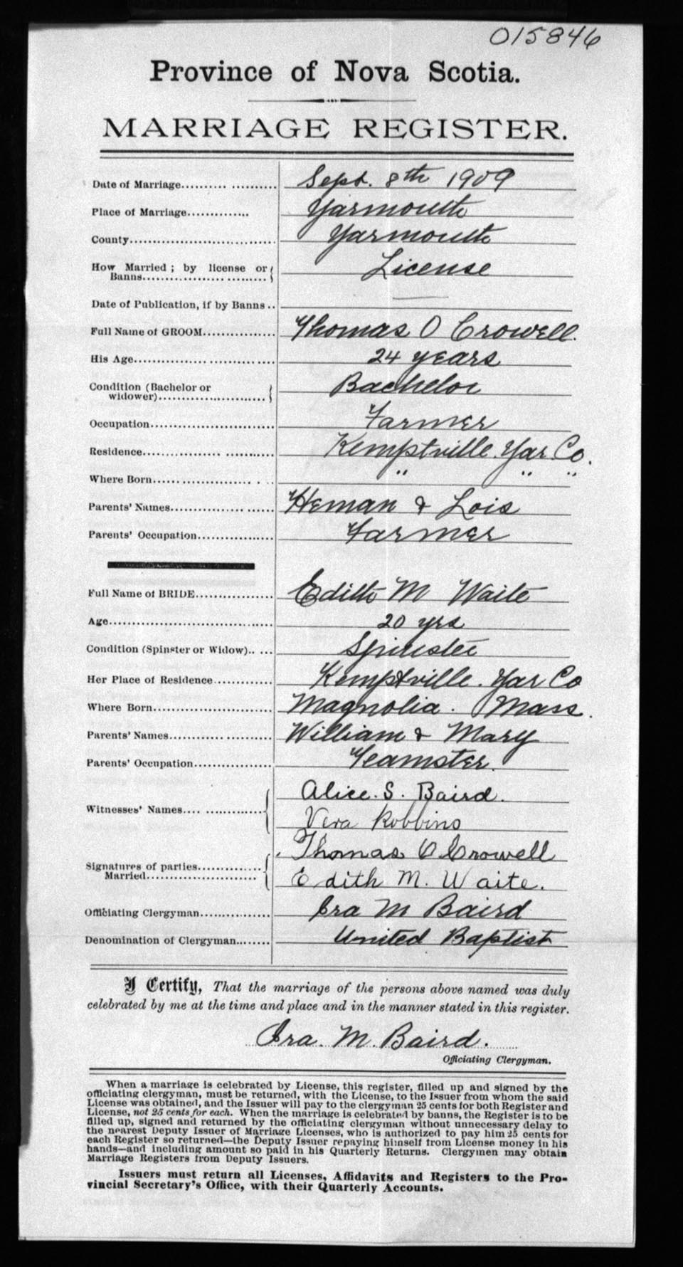 Registration: Year: 1909 number: 15846