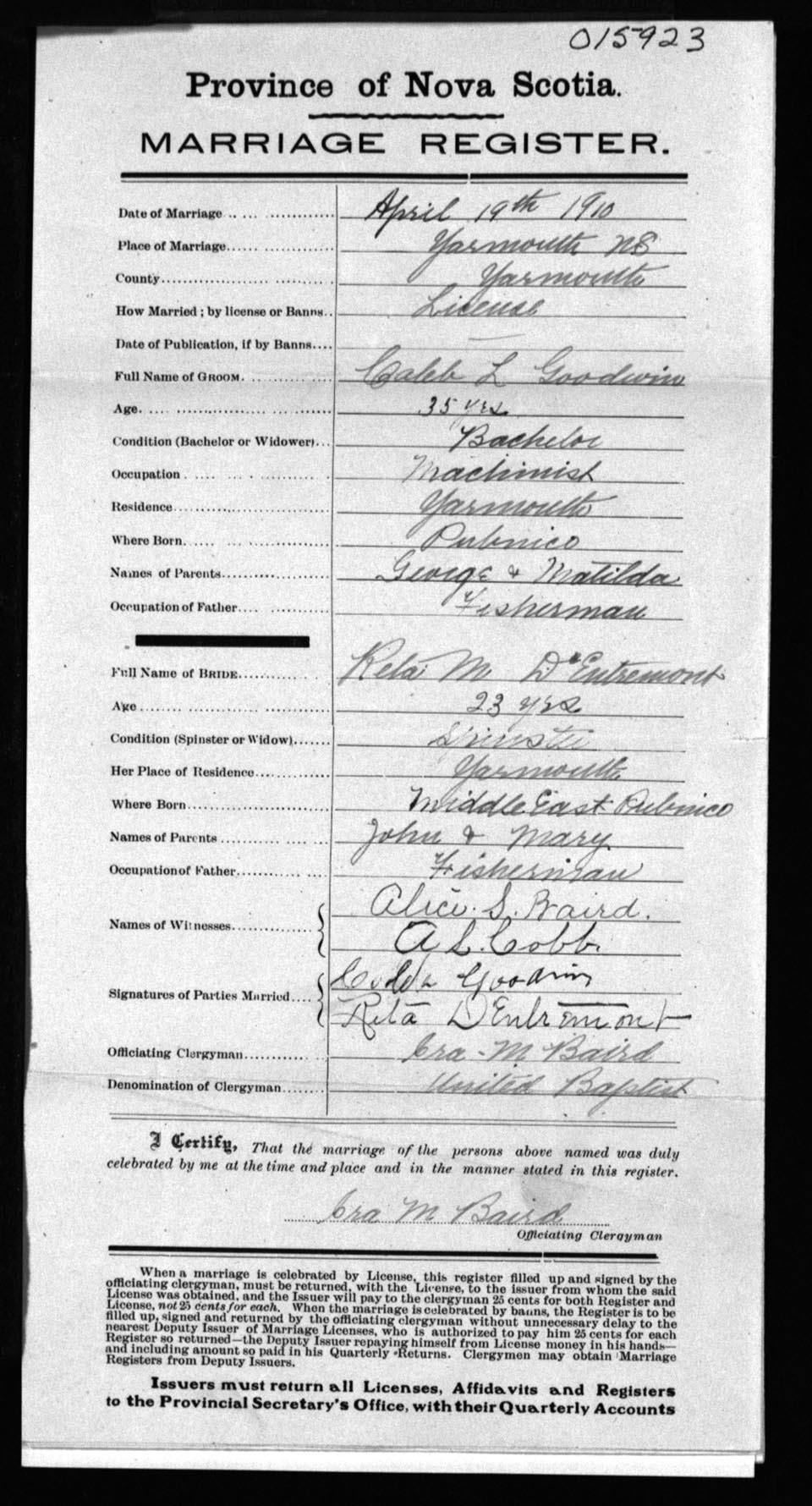 Registration: Year: 1910 number: 15923