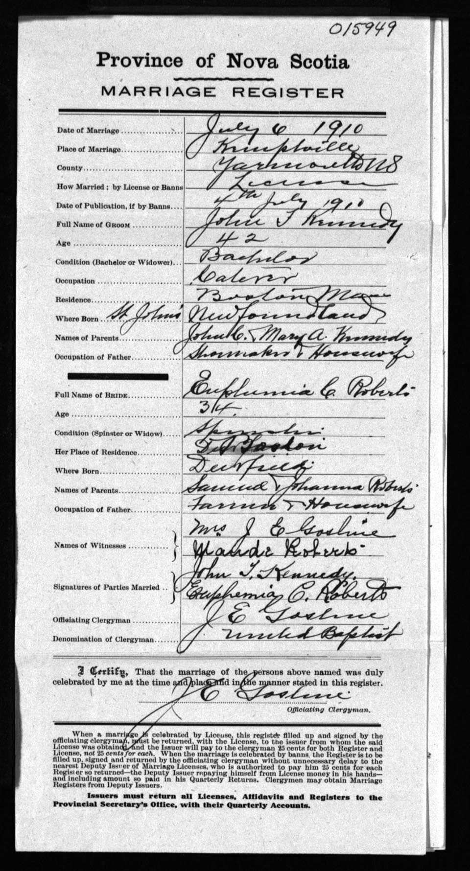Registration: Year: 1910 number: 15949