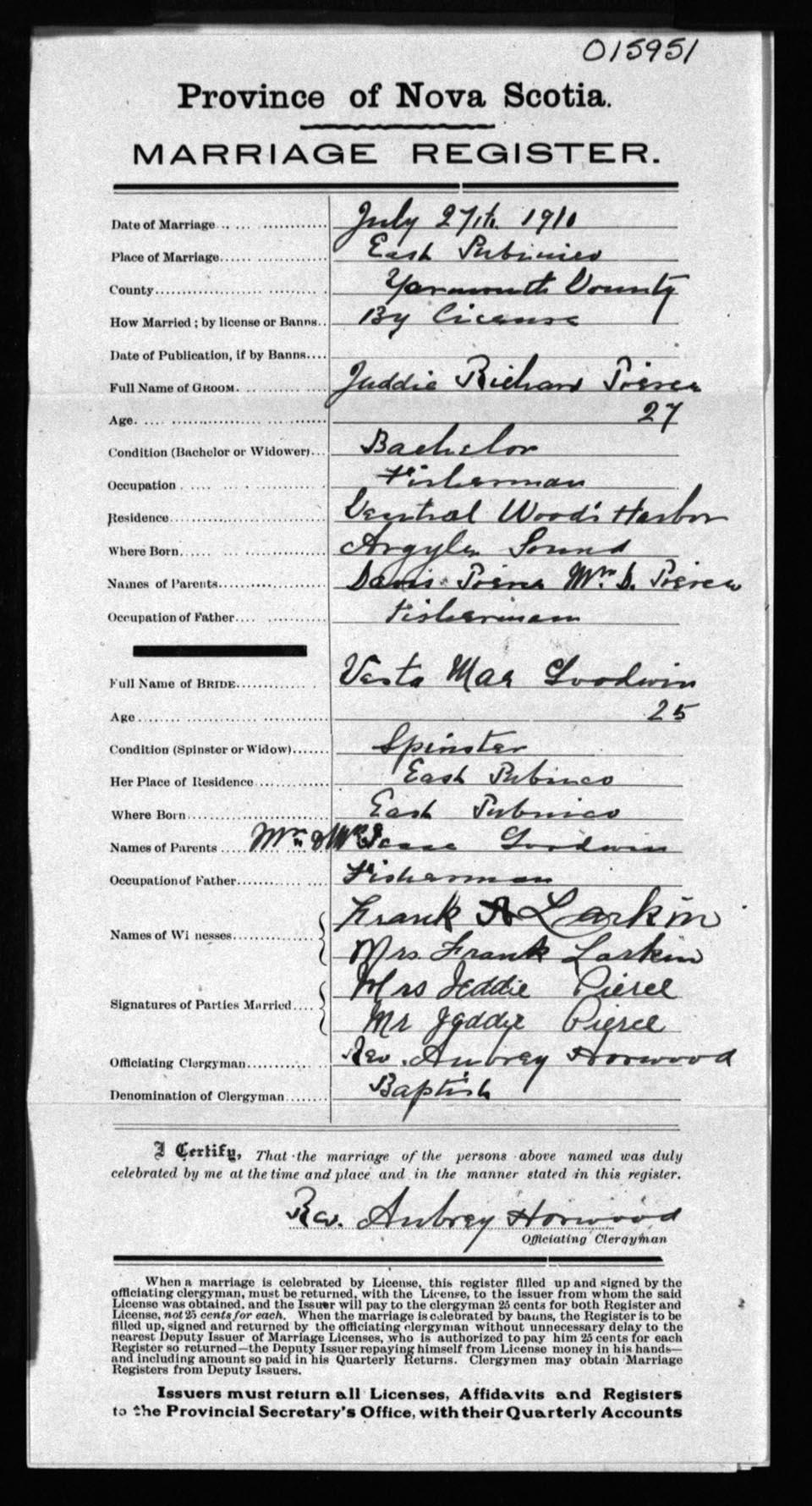 Registration: Year: 1910 number: 15951