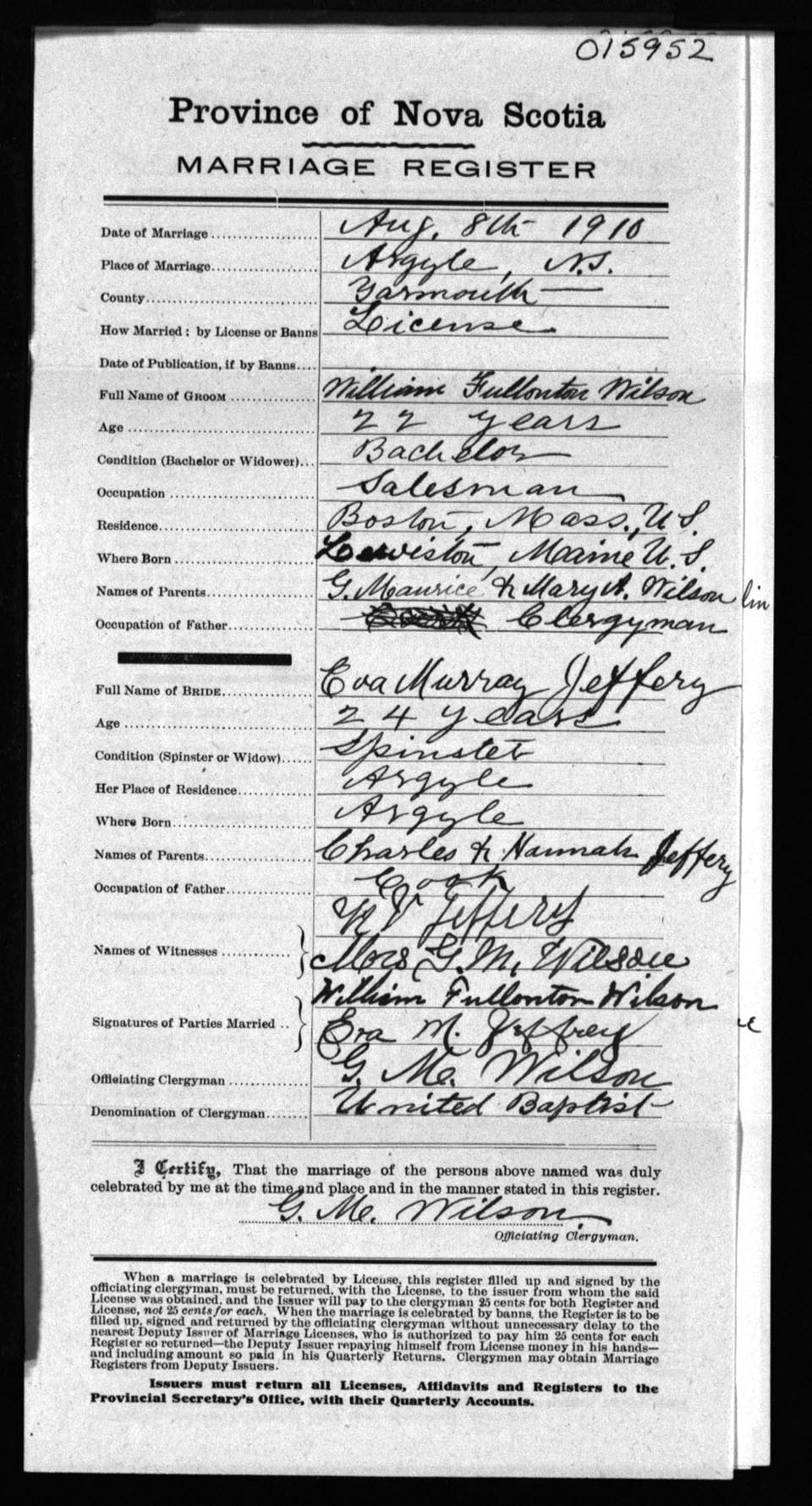 Registration: Year: 1910 number: 15952