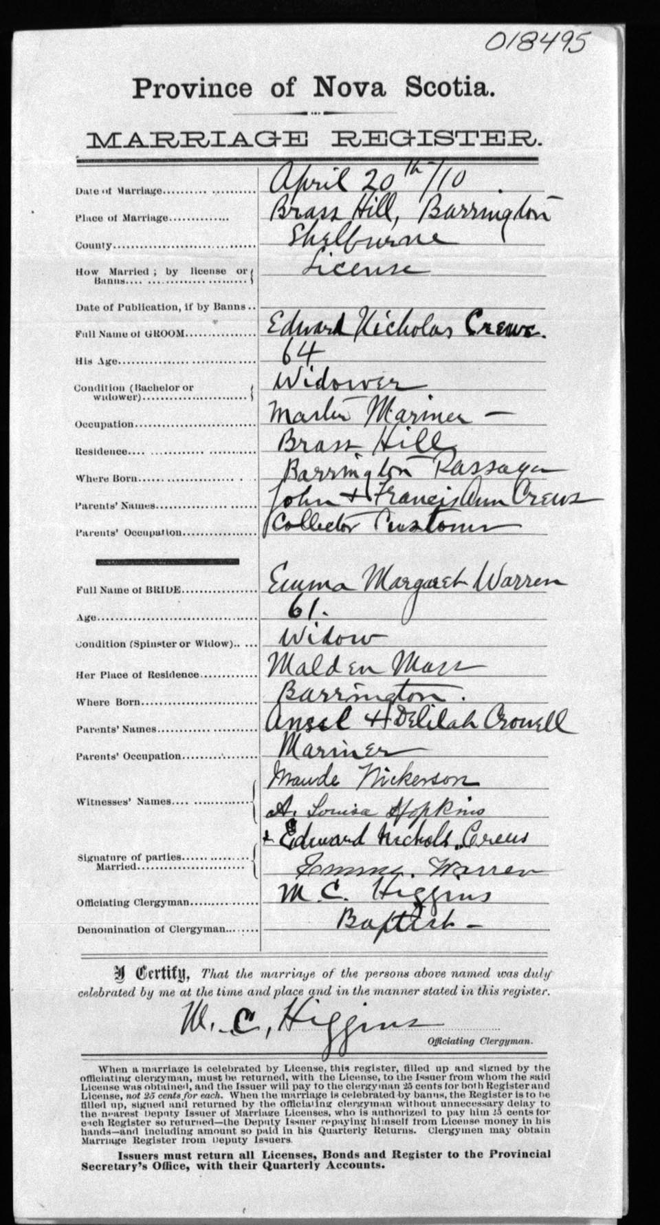 Registration: Year: 1910 number: 18495