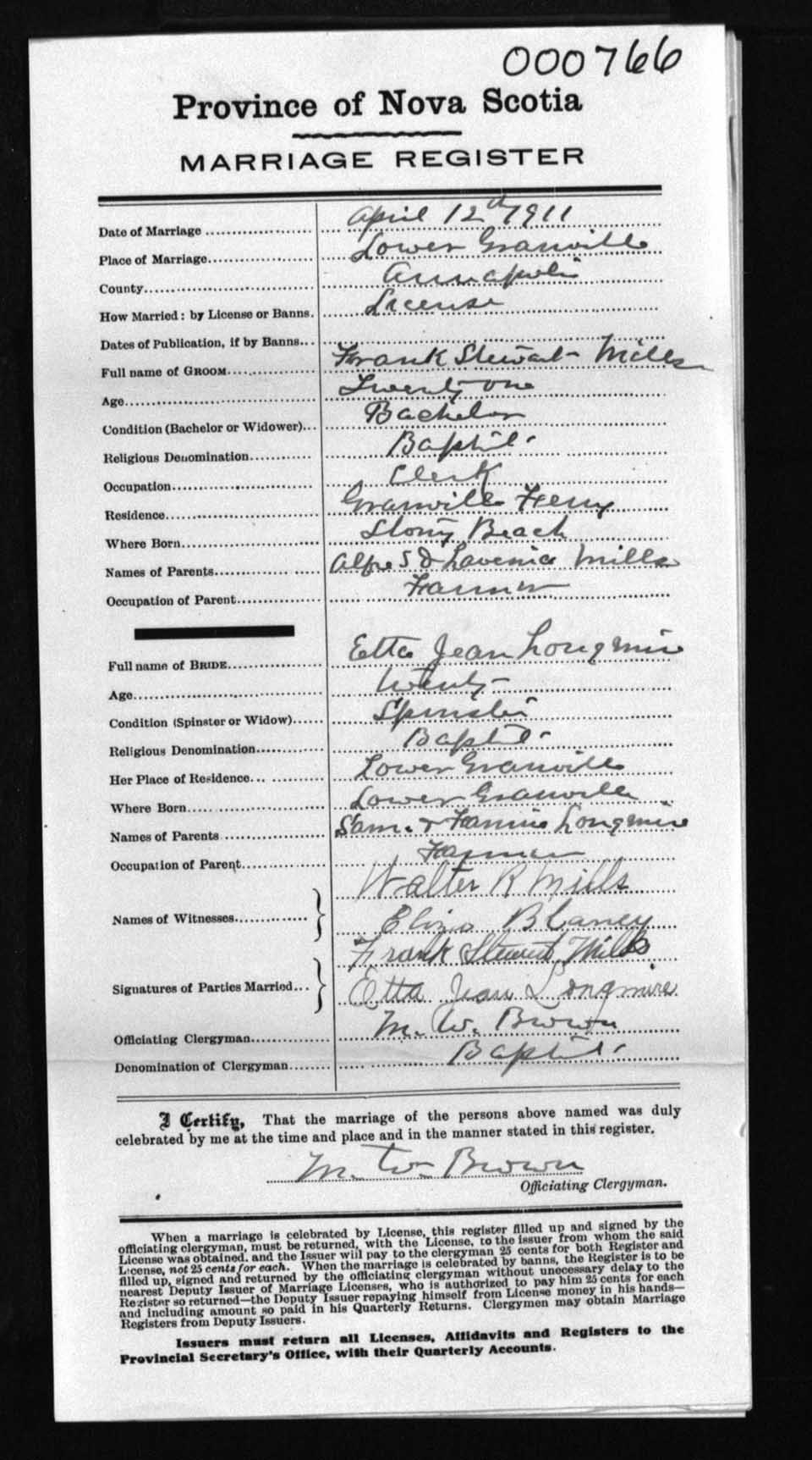 Registration: Year: 1911 number: 0766