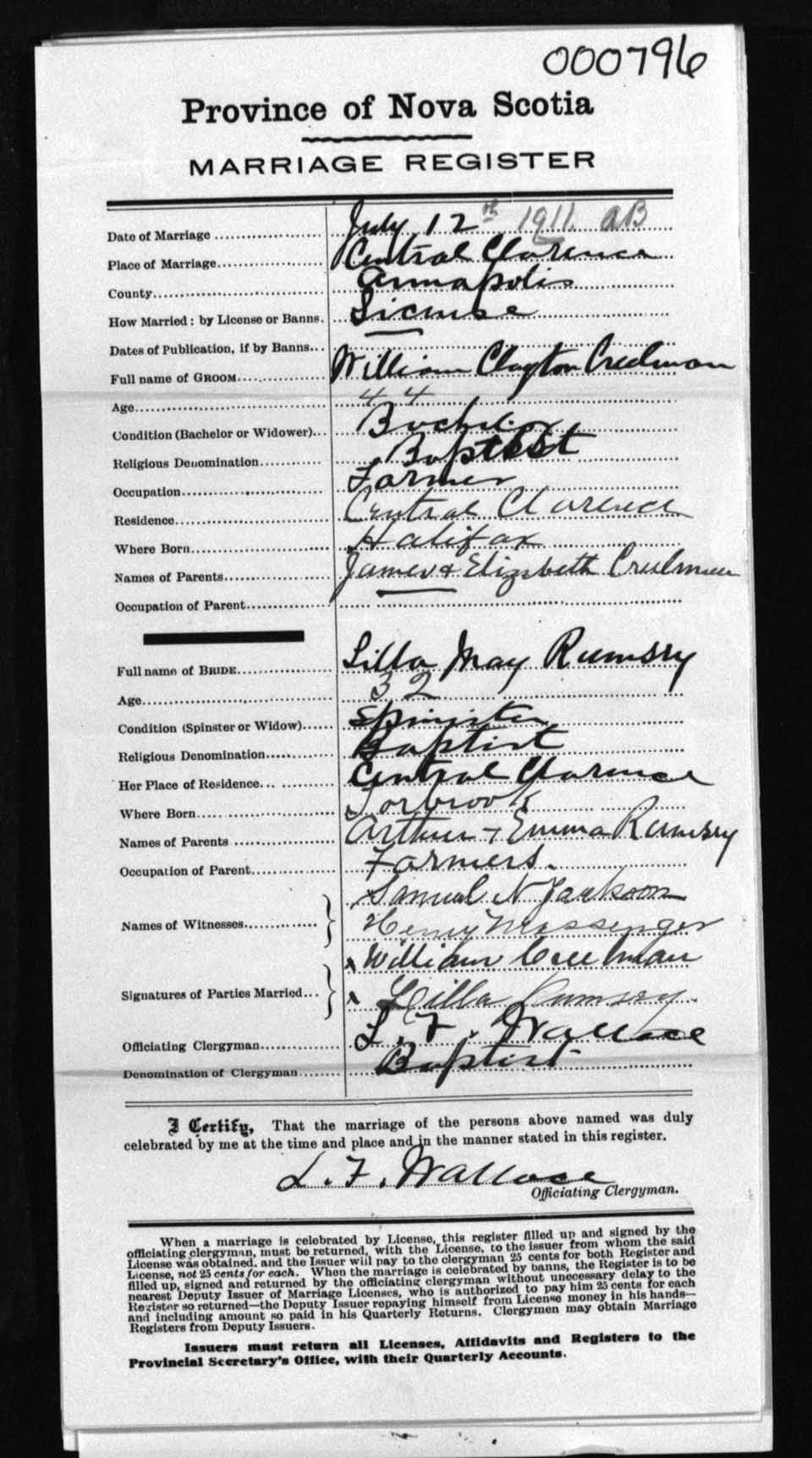 Registration: Year: 1911 number: 0796