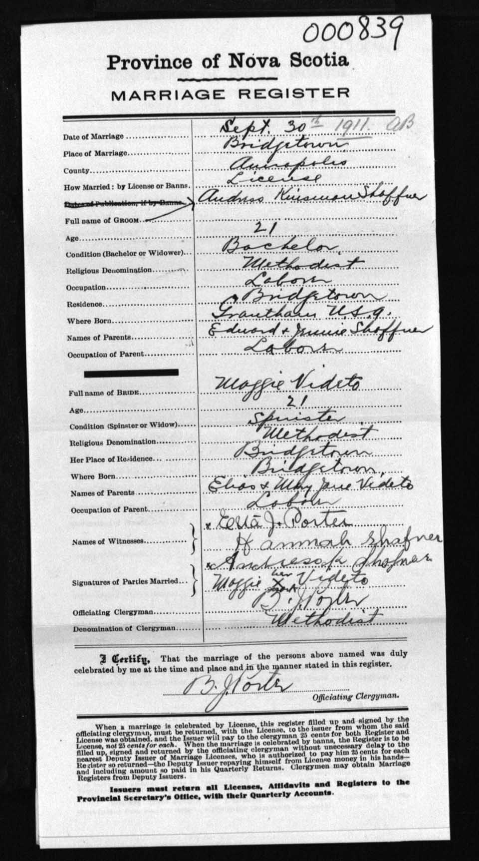 Registration: Year: 1911 number: 0839