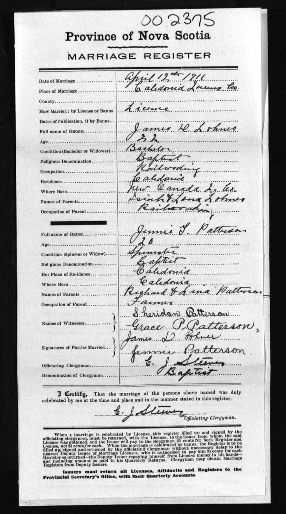 Registration: Year: 1911 number: 2375