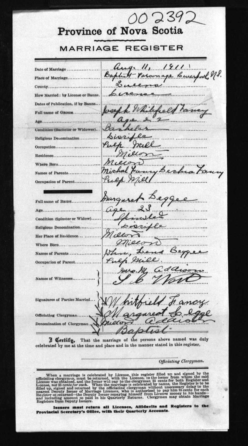 Registration: Year: 1911 number: 2392