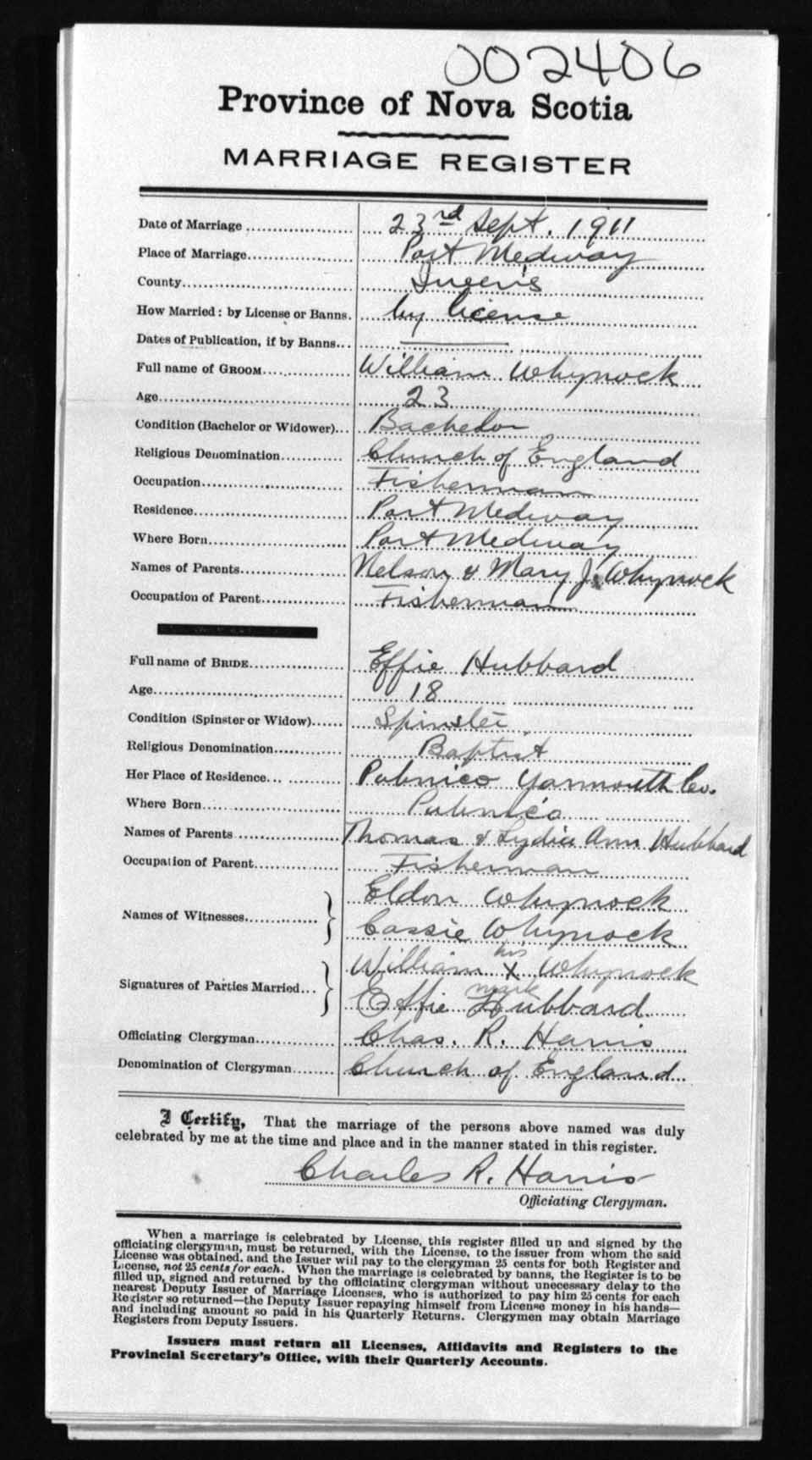 Registration: Year: 1911 number: 2406