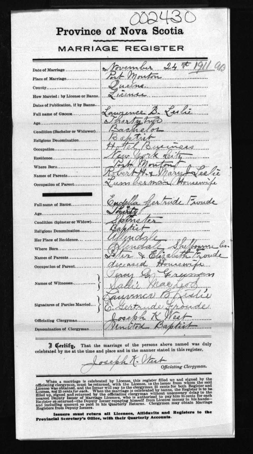 Registration: Year: 1911 number: 2430