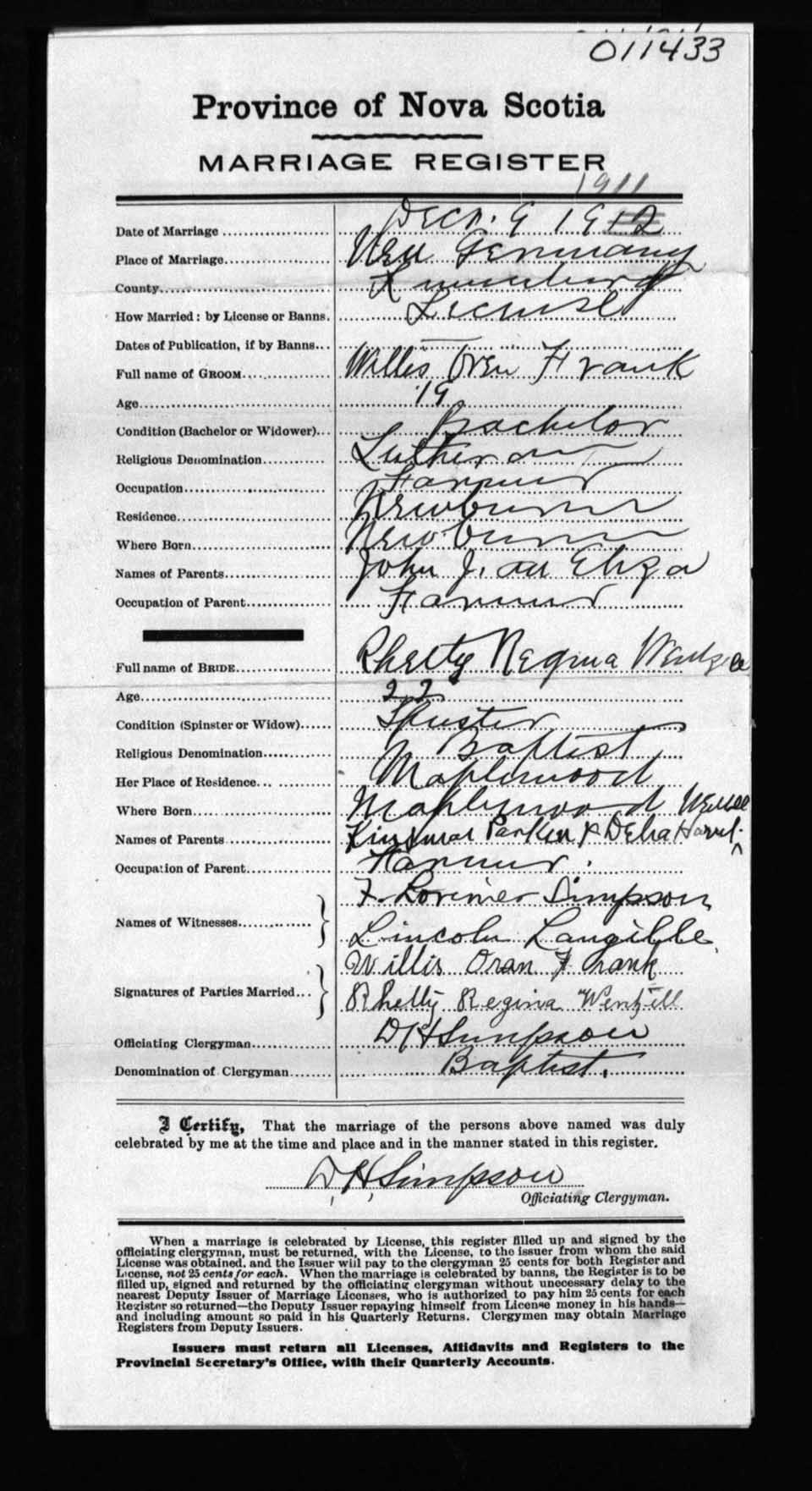 Registration: Year: 1911 number: 11433