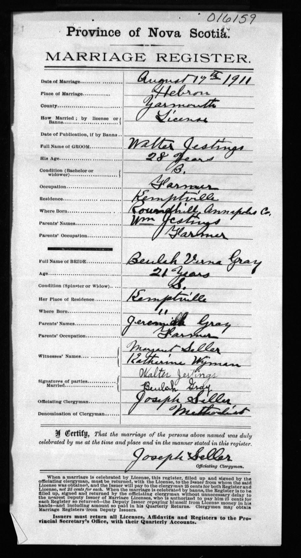Registration: Year: 1911 number: 16159