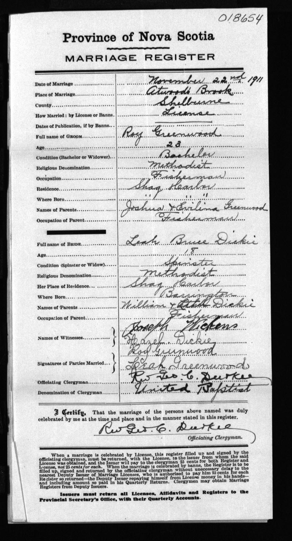 Registration: Year: 1911 number: 18654