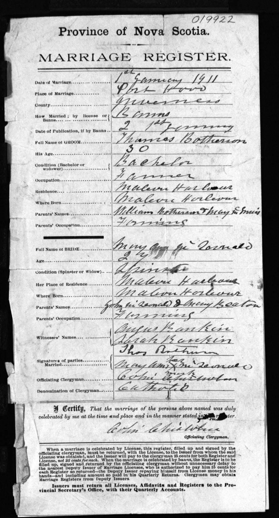 Registration: Year: 1911 number: 19922