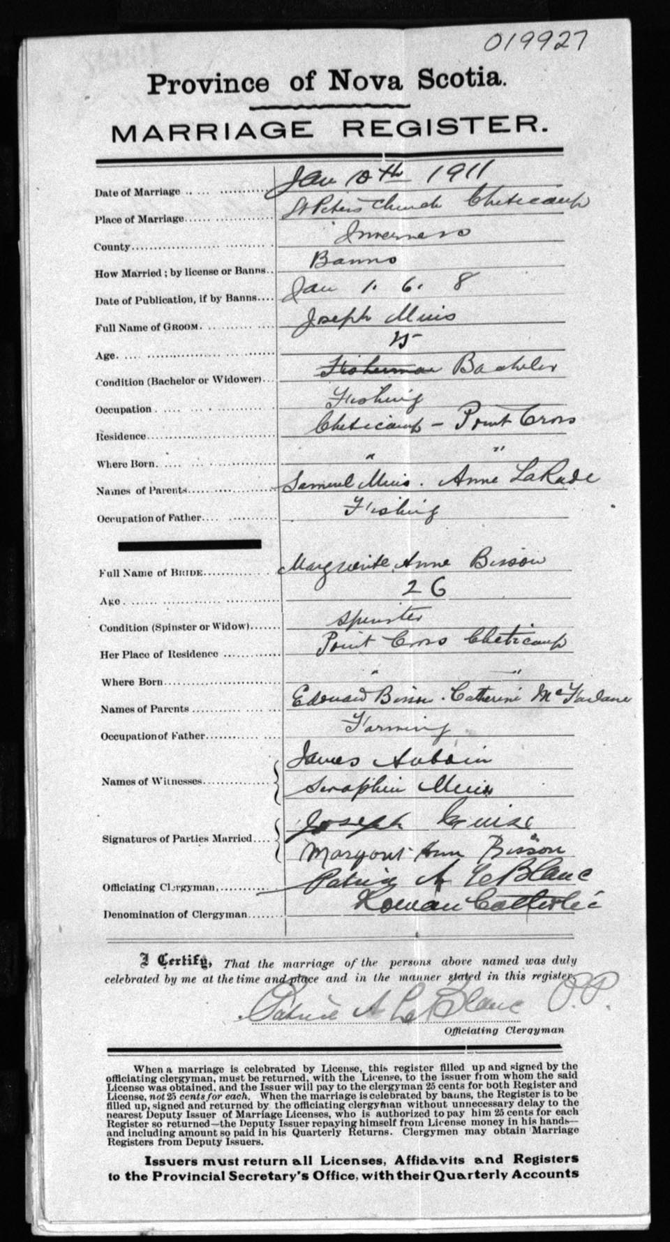 Registration: Year: 1911 number: 19927