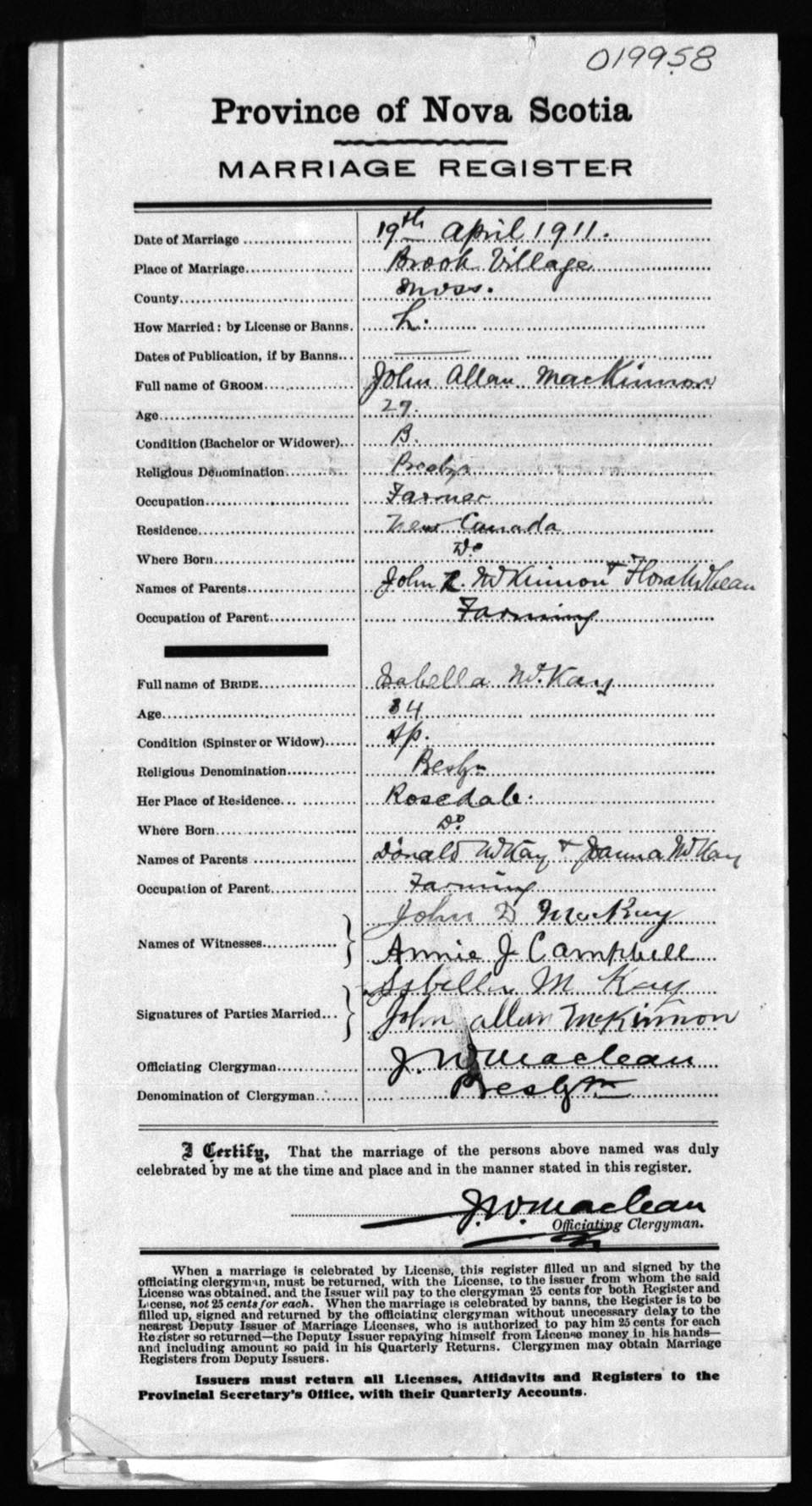 Registration: Year: 1911 number: 19958
