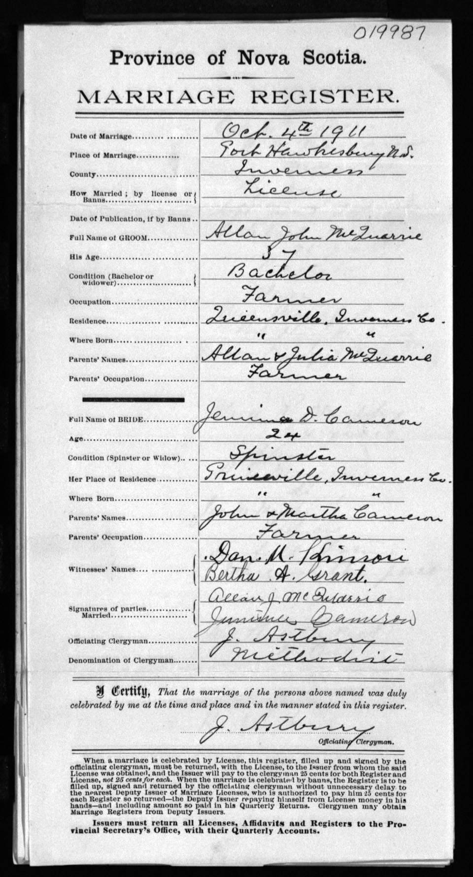 Registration: Year: 1911 number: 19987