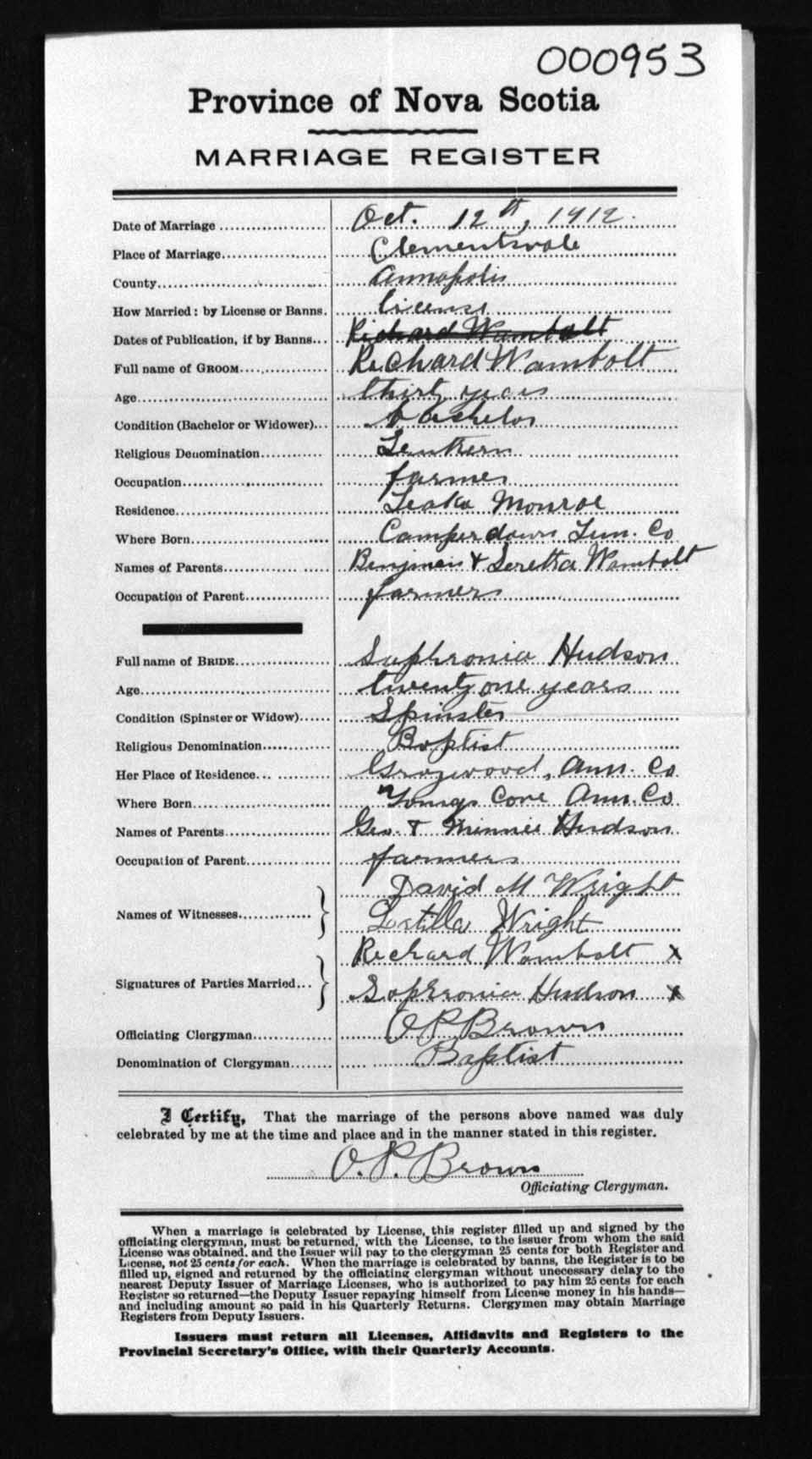 Registration: Year: 1912 number: 0953